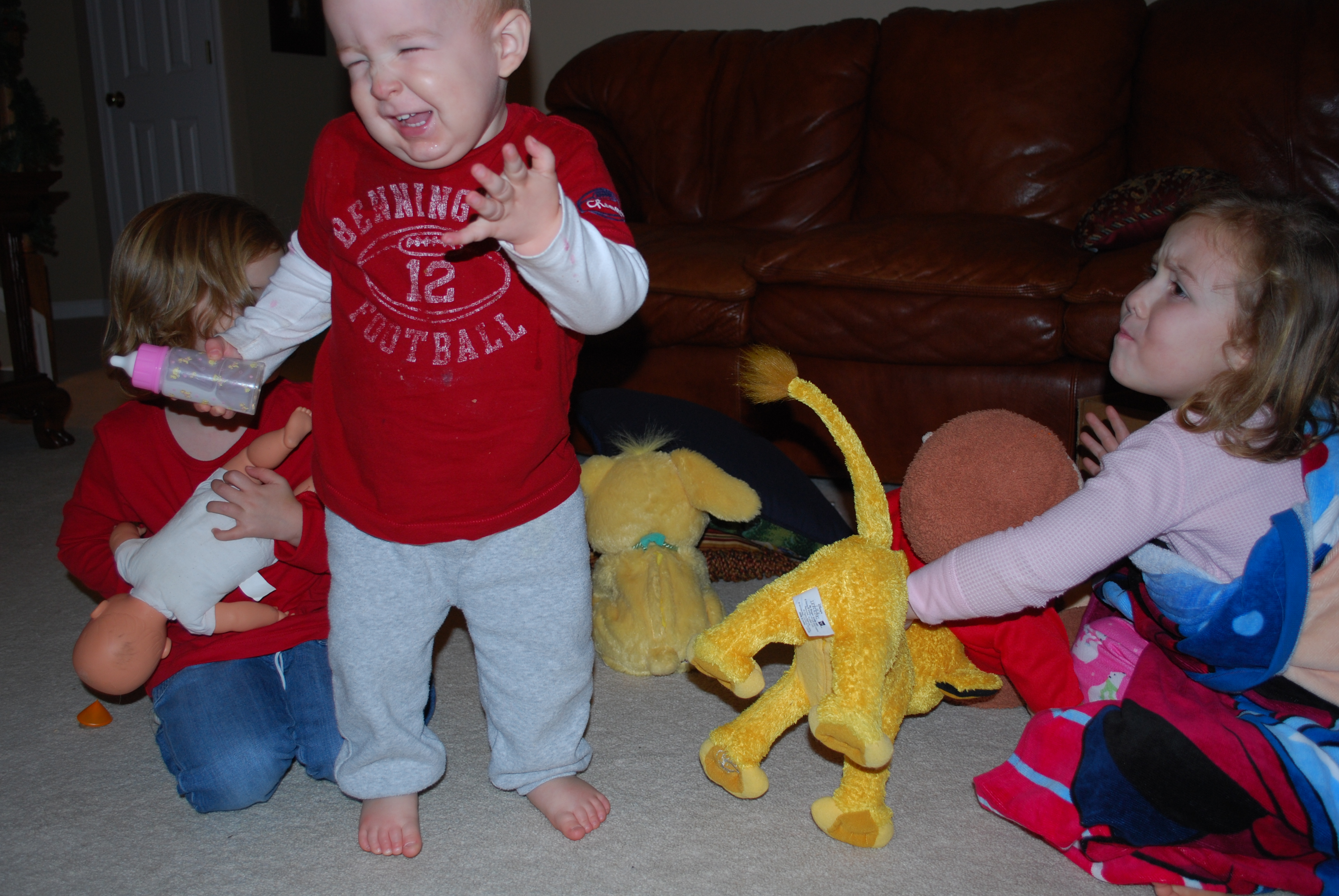 Molly and Ruby were re-enacting the Christmas Story. Molly was Mary. Ruby was a shepherd at this point….Mack was not really participating as a certain role. He was, however, making a mess of their production. I remember how he was sitting on the animals and running in and out of their performance. Obviously, Ruby was mad at him. And also, quite as obvious, Mack was having fun being a pest.